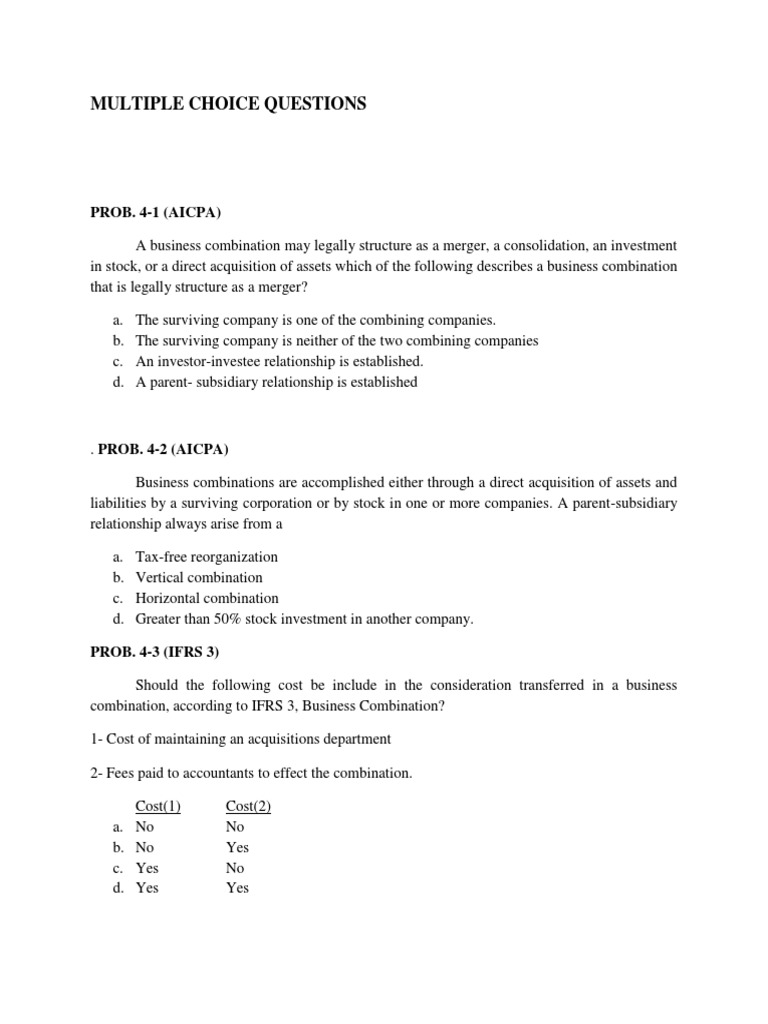 Principles for allocating the cost of a business combination re provided in SFAS 141 Business Combinations. Multiple choice Questions on Business Communication. The business is owned by one person.