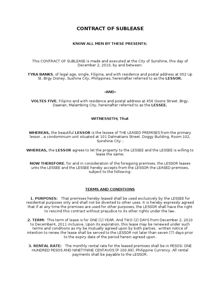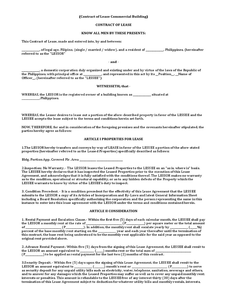 Both oral and written lease contracts are valid in the Philippines. USE OF THE PREMISES- The Lease is for the purpose of operating a commercial or retail business which the corporation is engaged in. Commercial Lease Agreements Nine Tenths of the Law One sided lease agreements in the Philippines are the rule of thumb and dont imagine for a second that they are in favor of the lessee.